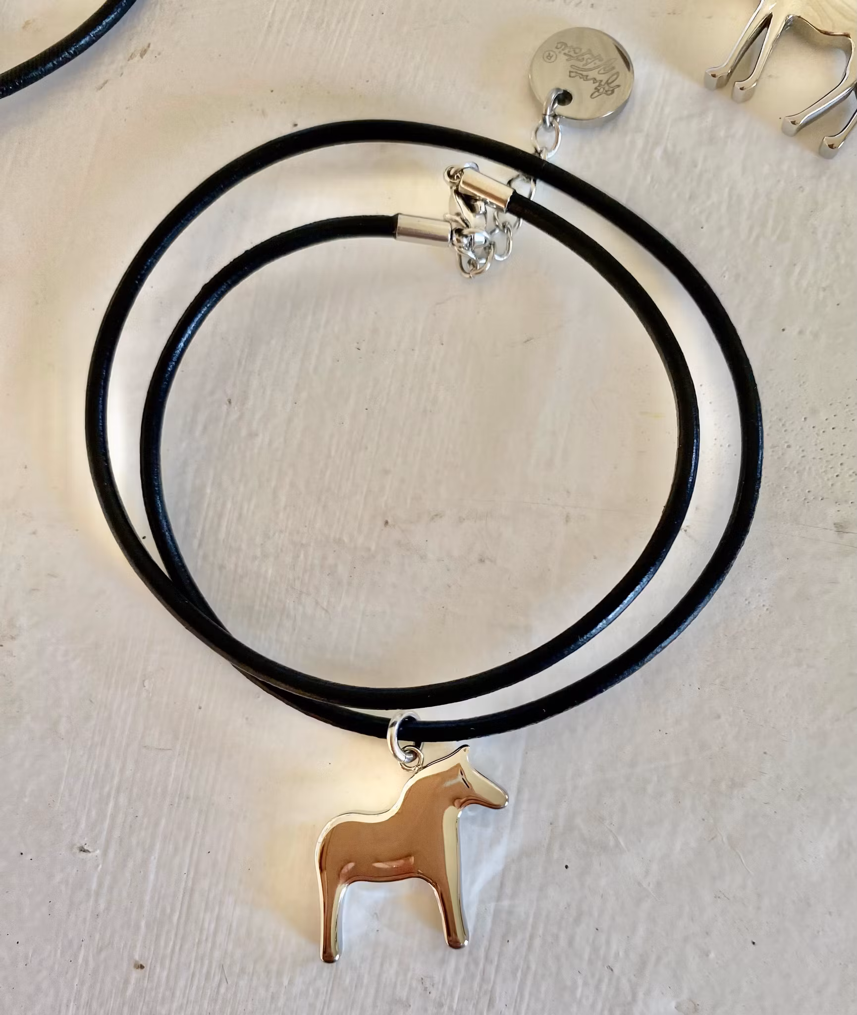 Läderhalsband 42cm, Berlock i kirurgiskt stål, Dalahäst